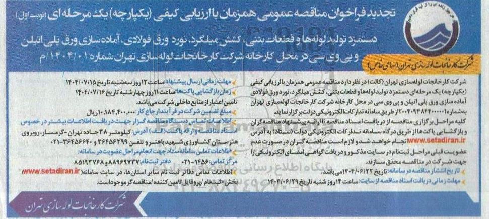 دستمزد تولید لوله ها و قطعات بتنی ، کشش میلگرد ، نورد ورق فولادی و اماده سازی ورق پلی اتیلن و پی وی سی در محل کارخانه شرکت کارخانجات لوله سازی تهران شماره 01/ 1404/ م