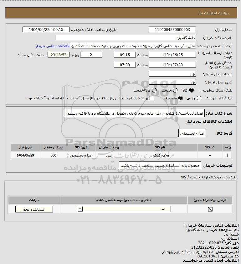 شرح کلی نیاز: تعداد 600حلب17 کیلویی روغن مایع سرخ کردنی وتحویل در دانشگاه یزد با فاکتور رسمی