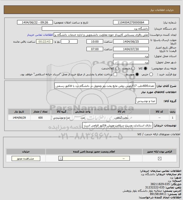 شرح کلی نیاز: تعداد600حلب 17کیلویی روغن مایع پخت وپز وتحویل در دانشگاه یزد با فاکتور رسمی