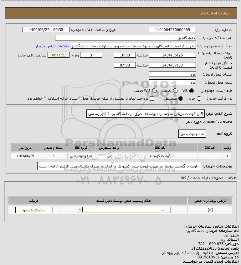 شرح کلی نیاز: 5تن گوشت برزیلی منجمد ران وراسته تحویل در دانشگاه یزد فاکتور رسمی