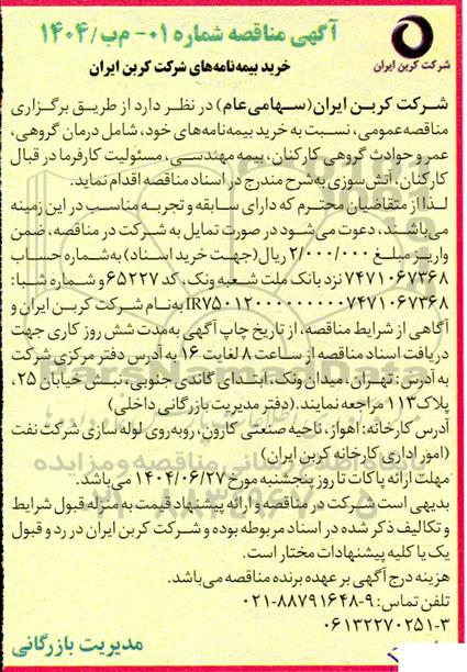 شرکت کربن ایران (سهامی عام) در نظر دارد از طریق برگزاری مناقصه عمومی نسبت به خرید بیمه نامه های خود شامل درمان گروهی عمر و حوادث گروهی کارکنان بیمه مهندسی مسئولیت کارفرما در قبال کارکنان آتش سوزی به شرح مندرج در اسناد مناقصه اقدام نماید.
