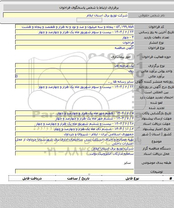 مناقصه تهیه مصالح و اجرای اسکلت بتنی ساختمان اداری برق شهرستان چرداول از محل اعتبارات داخلی از کلیه افراد متخصص و شرکتها واجد شرایط دعوت به عمل میآید در مناقصه با کد خبرگزاری پارس نماد: 9534208 شرکت نمایند.