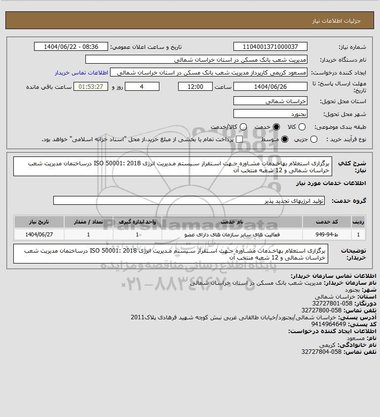 شرح کلی نیاز: برگزاری استعلام بهاخـدمات مشـاوره جـهت اسـتقرار سـیستم مـدیریت انرژی 2018 :50001 ISO درساختمان مدیریت شعب خراسان شمالی و 12 شعبه منتخب آن