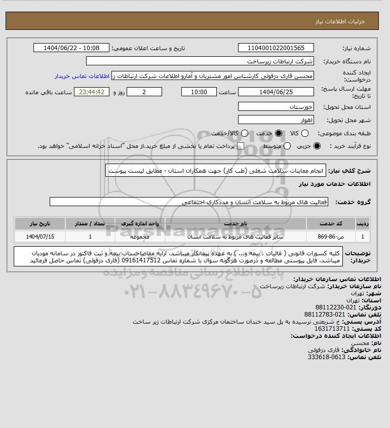 شرح کلی نیاز: انجام معاینات سلامت شغلی (طب کار) جهت همکاران استان - مطابق لیست پیوست