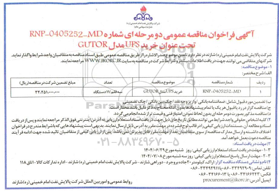 | 1 | RNP-0405252-MD | خرید UPS مدل GUTOR | سه قلم / 11 دستگاه | 32.251.000.000 |