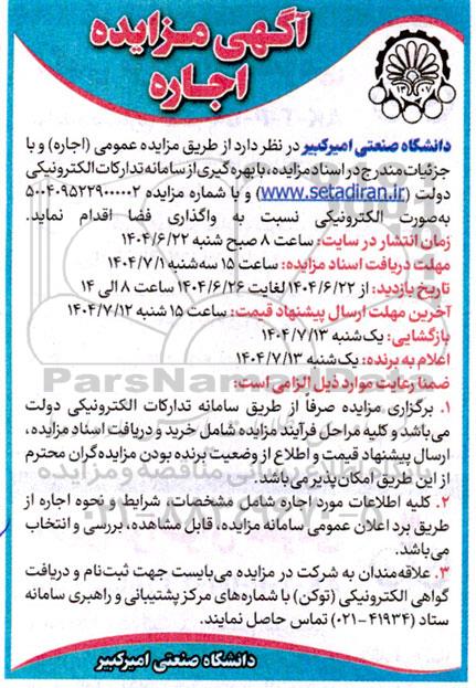 دانشگاه صنعتی امیرکبیر در نظر دارد از طریق مزایده عمومی (اجاره) و با جزییات مندرج در اسناد مزایده با بهره گیری از سامانه تدارکات الکترونیک دولت ستاد ایران و با شماره مزایده 5004095229000002 به صورت الکترونیکی نسبت به واگذاری فضا اقدام نماید.