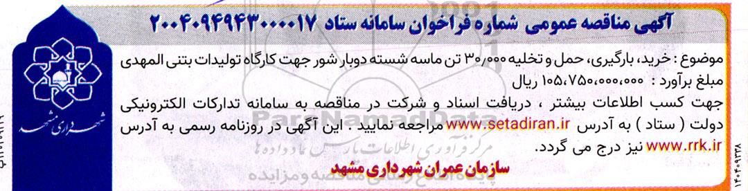 موضوع : خرید بارگیری حمل و تخلیه 30.000 تن ماسه شسته دوبار شور جهت کارگاه تولیدات بتنی المهدی مبلغ برآورد : 105.750.000.000 ریال