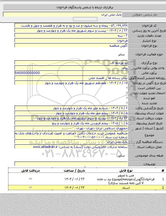 مناقصه عمومی خرید خدمات تأمین حفاظت و امنیت تعدادی از واحدهای بانک به شماره ثبت ستاد ۲۰۰۴۰۰۱۰۵۶۰۰۰۰۱