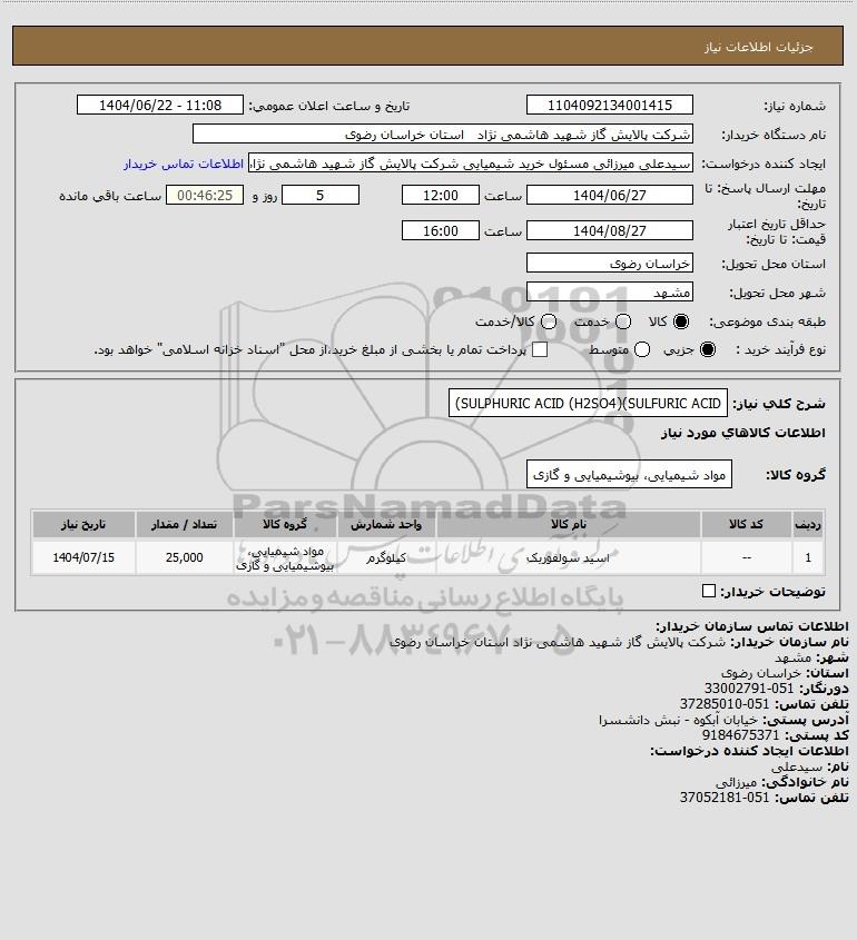 | 1 | -- | اسید سولفوریک | کیلوگرم | مواد شیمیایی، بیوشیمیایی و گازی | 25,000 | 1404/07/15 |