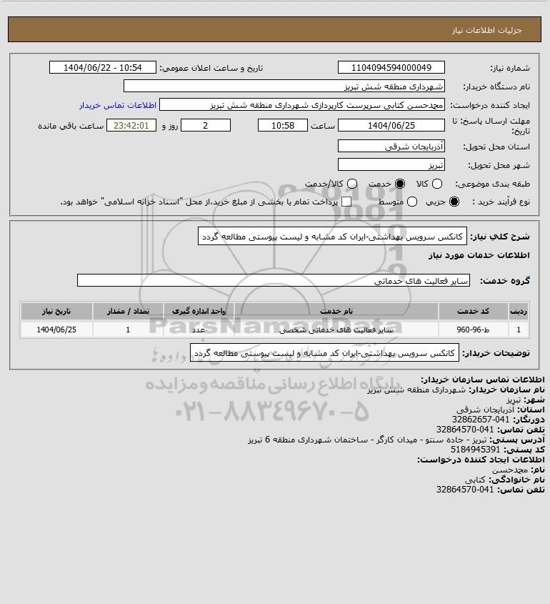 شرح کلی نیاز: کانکس سرویس بهداشتی-ایران کد مشابه و لیست پیوستی مطالعه گردد