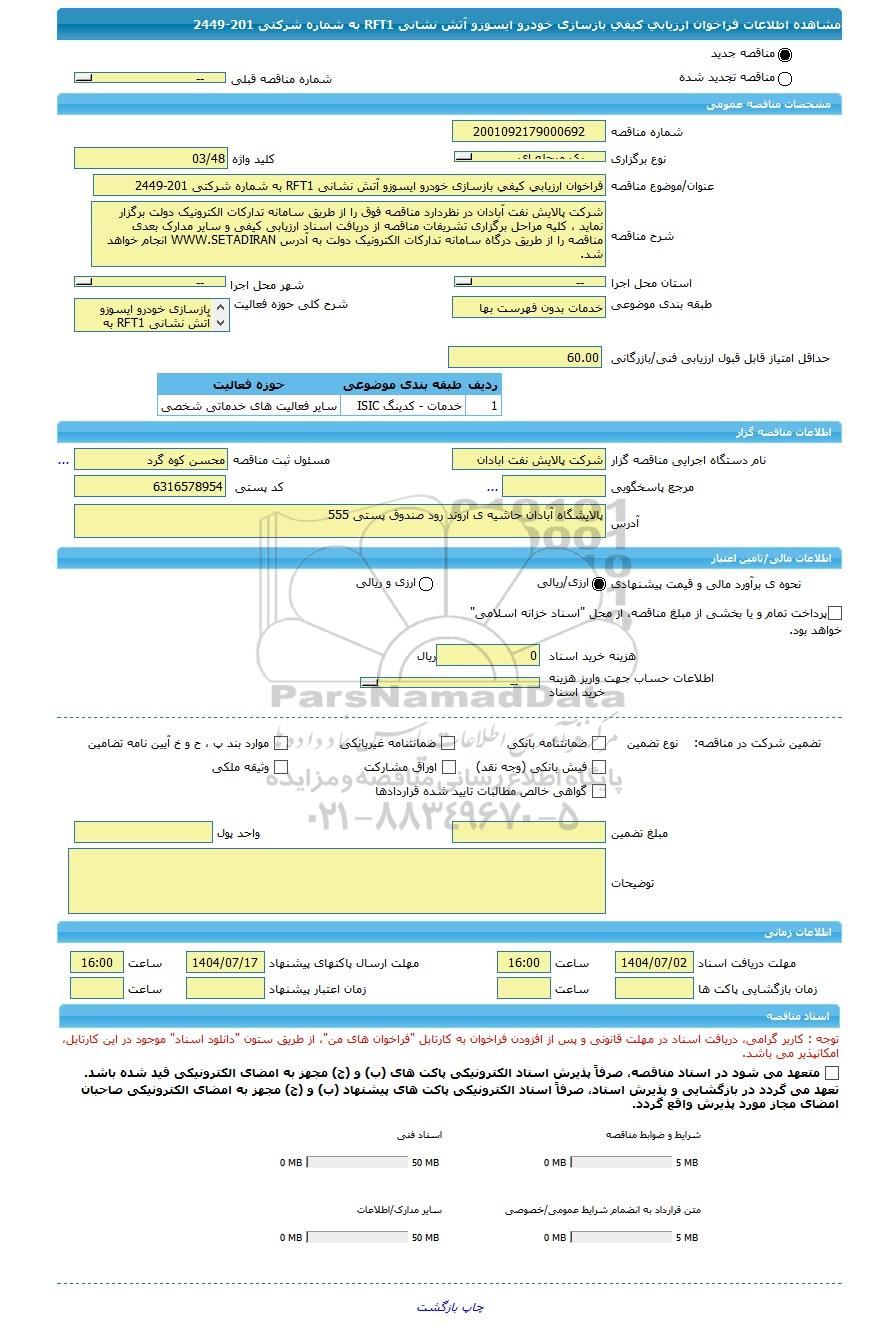 | نام دستگاه اجرایی مناقصه گزار | شرکت پالایش نفت ابادان | مسئول ثبت مناقصه | محسن کوه گرد |