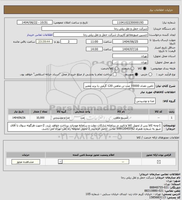 شرح کلی نیاز: تامین تعداد 10000 عدد تن ماهی 120 گرمی با برند معتبر