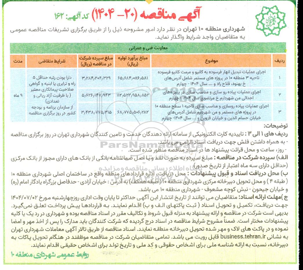 | 3 | اجرای عملیات پیاده روسازی و مناسب سازی ناحیه 1 سطح منطقه 10 در پروژه های مستمر و من شهر دارم شامل آدرسهای خیابان حسام الدین و خیابان قزوین و .... سال 1404 چهارم |