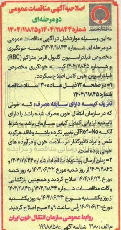 به این وسیله موارد ذیل در آگهی مناقصات عمومی دو مرحله ای شماره 1404/11844 کیسه خونگیری مخصوص فیلتراسیون گلبول قرمز متراکم (RBC) و شماره 1404/11845 کیسه خونگیری مخصوص فیلتراسیون خون کامل اصلاح میگردد.