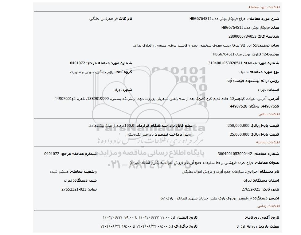 مزایده عمومی مزایده فرتوکار بوش مدل HBG6764S1I برگزار میگردد. از کلیه افراد متخصص و شرکتهای واجد شرایط دعوت به عمل میآید تا در این مزایده با کد خبرگزاری پارس نماد : 9535654 شرکت نمایند تاریخ شروع مزایده : 1404/06/22 مهلت شرکت در مزایده: تا پایان روز 1404/06/24 مکان برگزاری اموال واگذاری استانهای تهران و دستهبندیهای مربوط به این حراجی متفرقه میباشد.