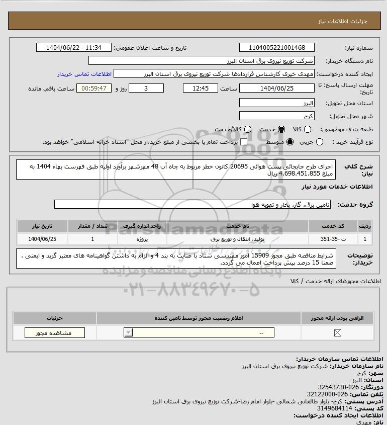 شرح کلی نیاز: اجرای طرح جابجائی پست هوائی 20695 کانون خطر مربوط به چاه آب 48 مهرشهر برآورد اولیه طبق فهرست بهاء 1404 به مبلغ 4.698.451.855 ریال