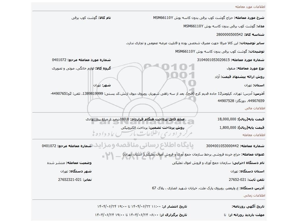 نام دستگاه اجرایی: سازمان جمع آوری و فروش اموال تملیکیوضعیت معامله: منتشر شده