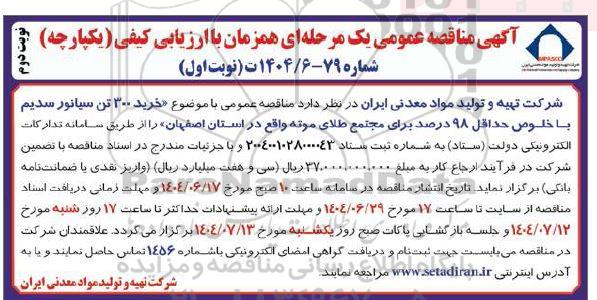 شرکت تهیه و تولید مواد معدنی ایران در نظر دارد مناقصه عمومی با موضوع خرید 300 تن سیانور سدیم با خلوص حداقف 98 درصد برای مجتمع طلای موته واقع در استان اصفهان را از طریق سامانه تدارکات الکترونیکی دولت ستاد به شماره ثبت ستاد 2004001028000043 و با جزییات مندرج در اسناد مناقصه با تضمین شرکت در فرآیند ارجاع کار به مبلغ 37.000.000.000 ریال (سی و هفت میلیارد) ریال واریز نقدی یا ضمانتنامه بانکی برگزار نماید.