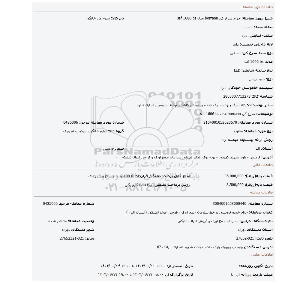 | عنوان معامله: حراج خرده فروشی بر خط سازمان جمع اوری و فروش اموال تملیکی (استان البرز ) | ||