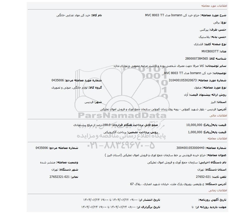 مزایده عمومی مزایده خرد کن bomann مدل MVC 8003 TT برگزار میگردد. از کلیه افراد متخصص و شرکتهای واجد شرایط دعوت به عمل میآید تا در این مزایده با کد خبرگزاری پارس نماد : 9536030 شرکت نمایند تاریخ شروع مزایده : 1404/06/22 مهلت شرکت در مزایده: تا پایان روز 1404/06/24 مکان برگزاری اموال واگذاری استانهای البرز و دستهبندیهای مربوط به این حراجی متفرقه میباشد.
