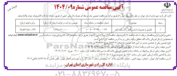 مناقصه عمومی تکمیل و تعمیرات اساسی انبار راکد یافت آباد- نوبت دوم از کلیه افراد متخصص و شرکتها واجد شرایط دعوت به عمل میآید در مناقصه با کد خبرگزاری پارس نماد: 9536285 شرکت نمایند.