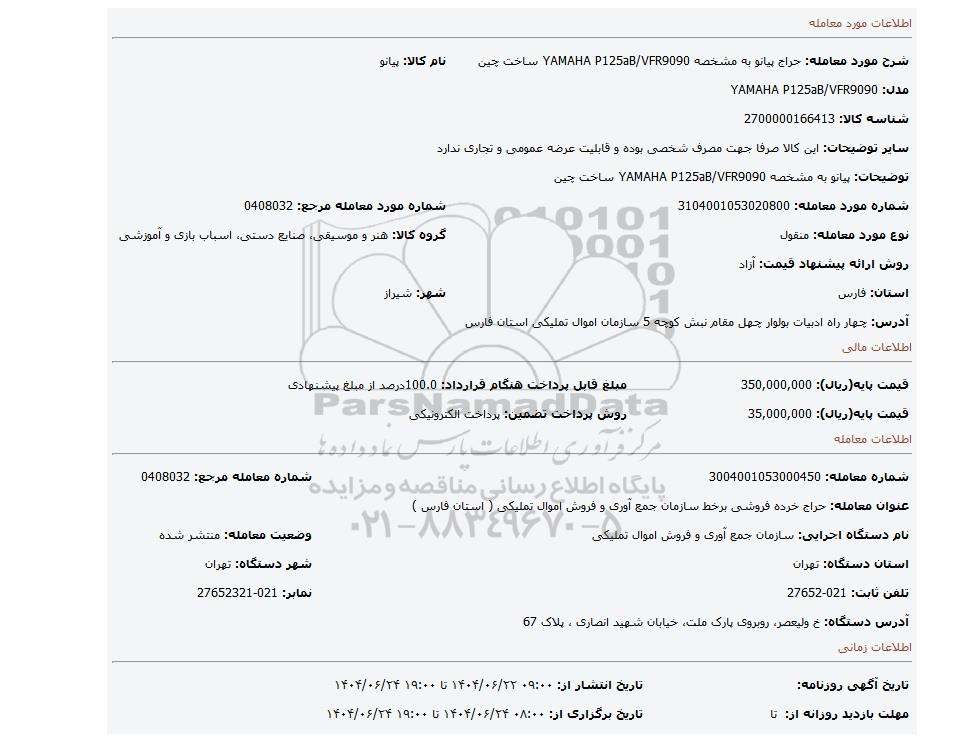 عنوان معامله: حراج خرده فروشی برخط سازمان جمع آوری و فروش اموال تملیکی ( استان فارس )