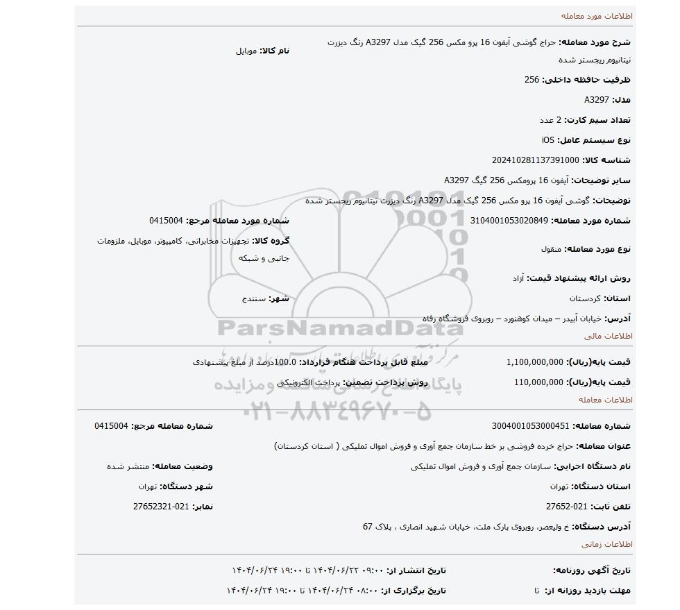 | شماره مورد معامله: 3104001053020849 | شماره مورد معامله مرجع: 0415004 | |