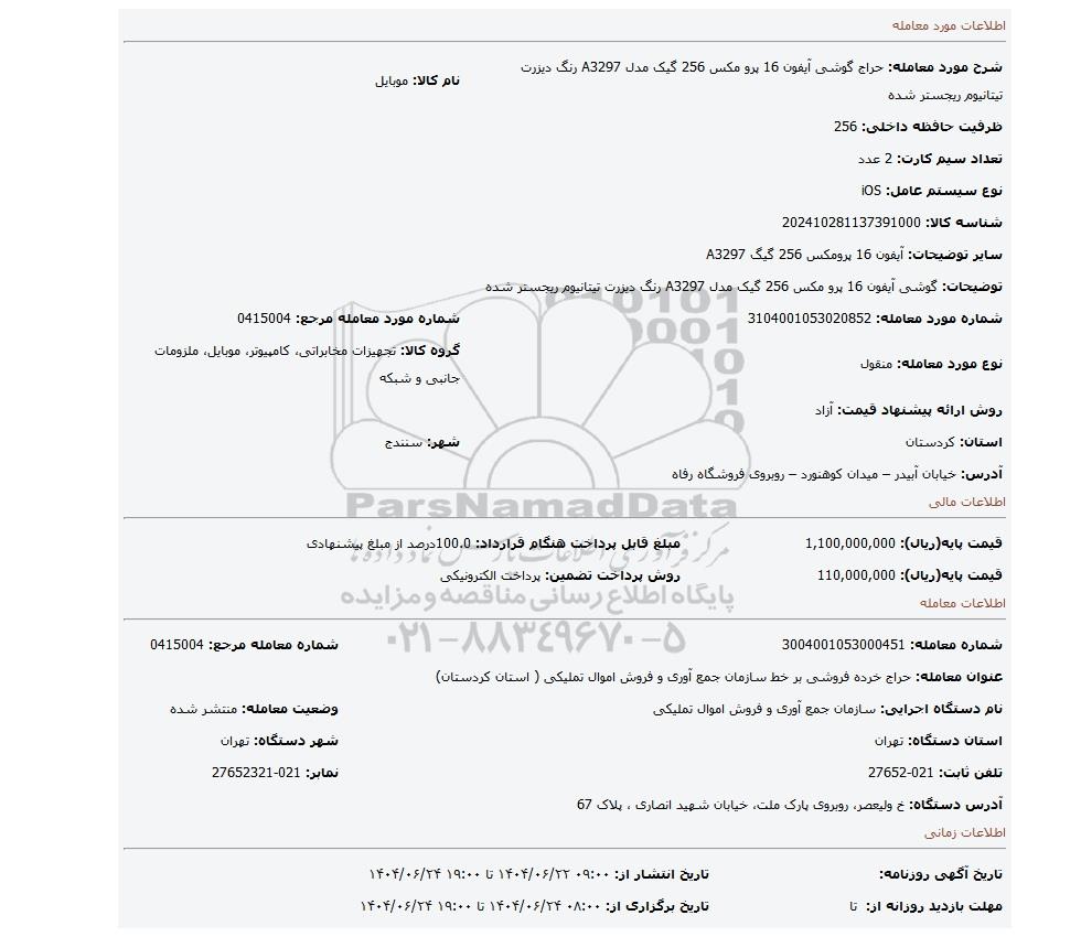 عنوان معامله: حراج خرده فروشی بر خط سازمان جمع آوری و فروش اموال تملیکی ( استان کردستان)