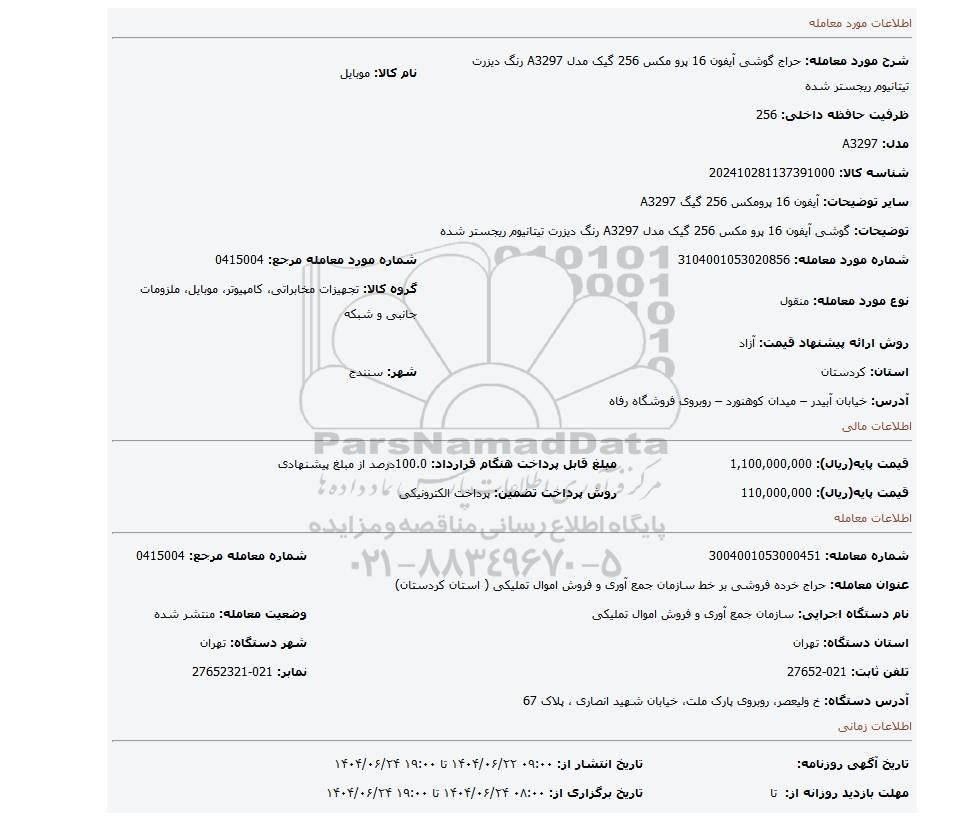 | شماره مورد معامله: 3104001053020856 | شماره مورد معامله مرجع: 0415004 | |