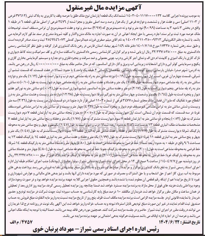 مزایده فروش ششدانگ یک قطعه آپارتمان به پلاک ثبتی 37612 فرعی از 1103 اصلی به مبلغ 32.337.525.000 ریال