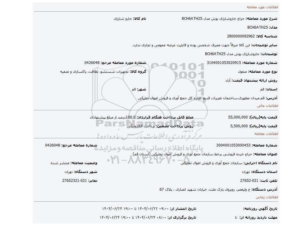 | شماره مورد معامله: 3104001053020915 | شماره مورد معامله مرجع: 0426048 | |