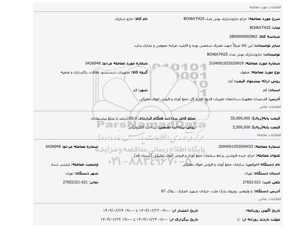 مزایده عمومی مزایده جاروشارژی بوش مدل BCH6ATH25 برگزار میگردد. از کلیه افراد متخصص و شرکتهای واجد شرایط دعوت به عمل میآید تا در این مزایده با کد خبرگزاری پارس نماد : 9536550 شرکت نمایند تاریخ شروع مزایده : 1404/06/22 مهلت شرکت در مزایده: تا پایان روز 1404/06/24 مکان برگزاری اموال واگذاری استانهای قم و دستهبندیهای مربوط به این حراجی متفرقه میباشد.