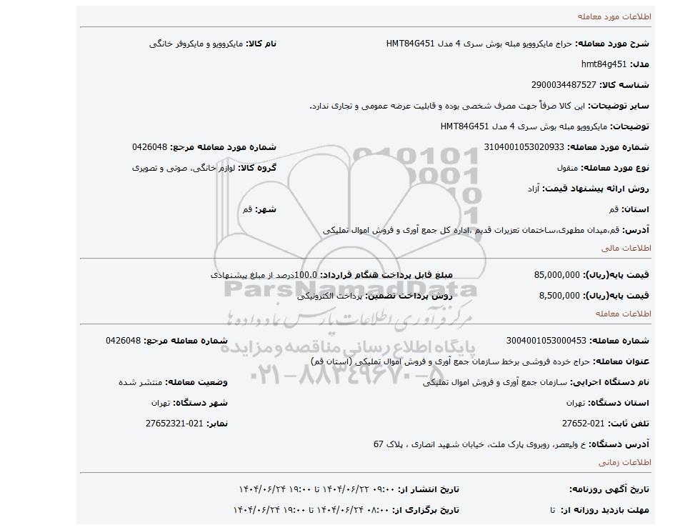 | شماره مورد معامله: 3104001053020933 | شماره مورد معامله مرجع: 0426048 | |