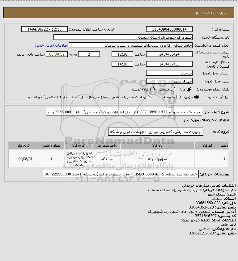 توضیحات خریدار:خرید یک عدد سوئیچ CISCO 3850 48TS از محل اعتبارات دولت (ذیحسابی) مبلغ 225500000 ریال