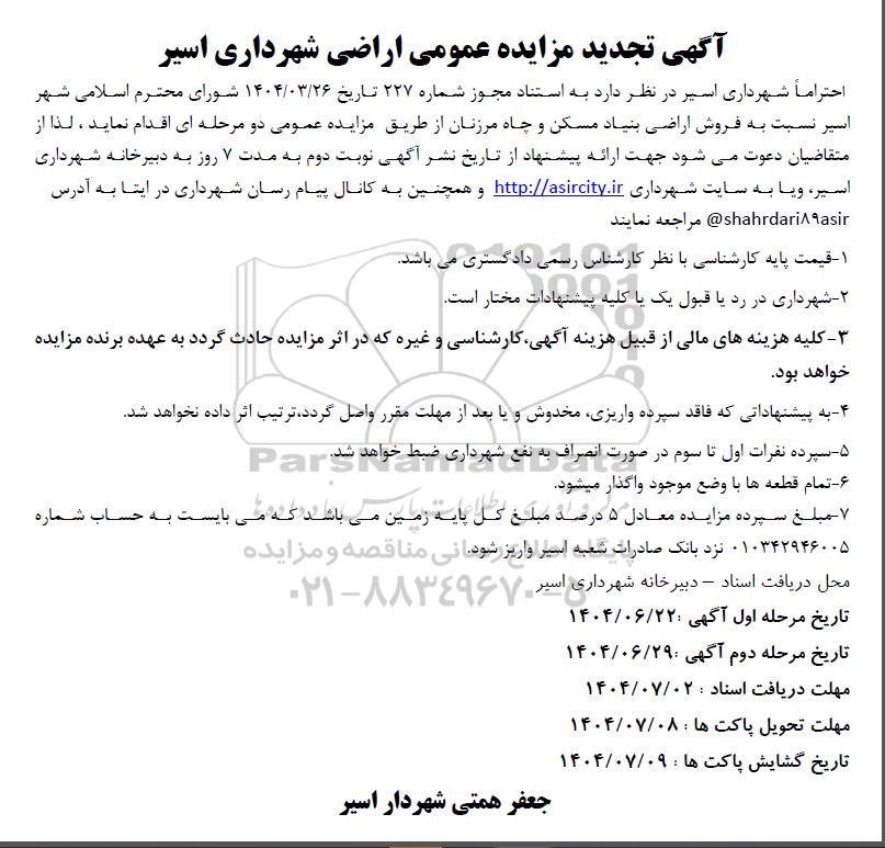آگهی تجدید مزایده عمومی اراضی شهرداری اسیر ؟