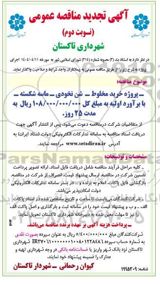 شهرداری تاکستان در نظر دارد به استناد بند ((3) مصوبه شماره (314) شورای اسلامی شهر به مورخه 1404.04.11 اجرای پروژه به شرح زیر را از طریق مناقصه عمومی به پیمانکاران واجد شرایط و صلاحیت واگذار نماید .