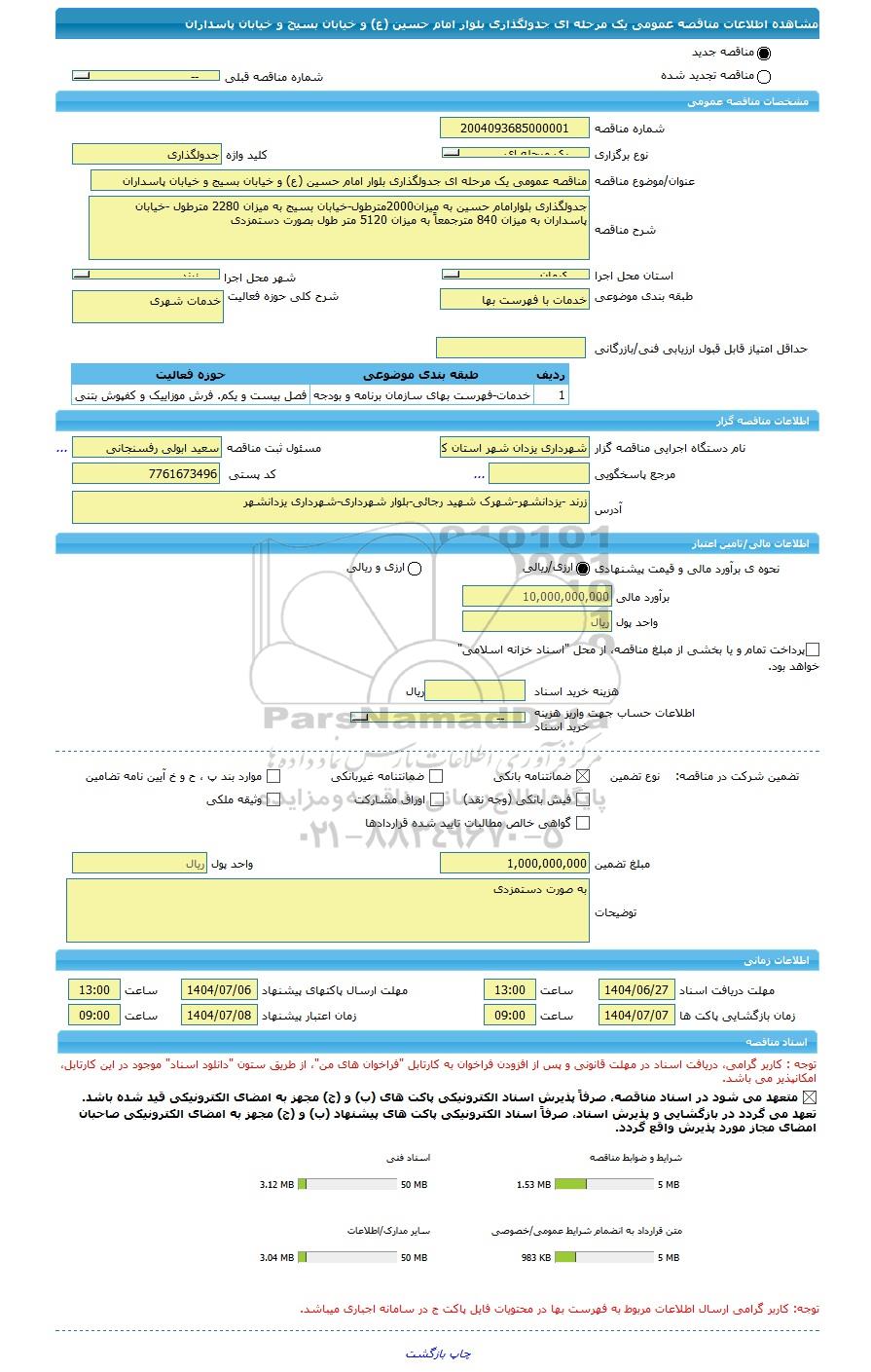 | عنوان/موضوع مناقصه | مناقصه عمومی یک مرحله ای جدولگذاری بلوار امام حسین (ع) و خیابان بسیج و خیابان پاسداران | ||||||||