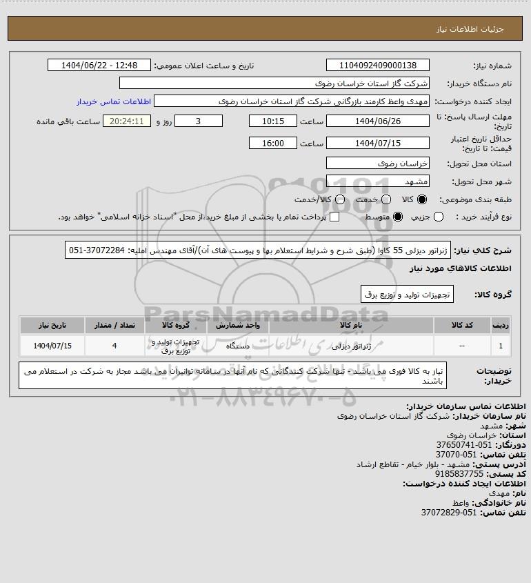 شرح کلی نیاز: ژنراتور دیزلی 55 کاوا (طبق شرح و شرایط استعلام بها و پیوست های آن)/آقای مهندس املیه: 37072284-051