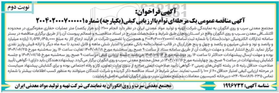 مجتمع معدنی سرب و روی انگوران به نمایندگی شرکت تهیه و تولید مواد معدنی ایران در نظر دارد انجام 2100 (دو هزار یکصد) متر عملیات حفاری مغزه گیری در محدوده اکتشافی معدن سرب و روی انگوران واقع در استان زنجان طبق شرایط و مشخصات مندرج در اسناد مناقصه و ضمائم پیوست آن را از طریق برگزاری مناقصه در بستر سامانه تدارکات الکترونیکی دولت (ستاد) با شماره ثبت سامانه 2004020007000001 و همچنین با تضمین شرکت در فرآیند ارجاع کار به مبلغ 11.596.145.000 (یازده میلیارد و پانصد و نود و شش میلیون و یکصد و چهل و پنج هزار ریال) در قالب ضمانت نامه بانکی معتبر با اعتبار شش ماهه و قابل تمدید تا سه ماه دیگر یا ارائه فیش واریز نقدی برگزار نماید تاریخ انتشار اسناد و مهلت دریافت آن از طریق سامانه ستاد از ساعت 9 صبح روز سه شنبه مورخ 1404.06.18 لغایت ساعت 16 روز سه شنبه مورخ 1404.06.25 بوده و مهلت ارسال پیشنهادات حداکثر تا ساعت 16 روز دوشنبه مورخ 1404.07.14 می باشد جلسه ارزیابی کیفی در ساعت 9 صبح روز سه شنبه مورخ 1404.07.15 و جلسه گشایش پیشنهادات در ساعت 9 صبح روز چهارشنبه مورخ 1404.07.16 در محل مجتمع معدنی سرب و روی انگوران برگزار می گردد. پیشنهاد دهندگان باید دارای 1- گواهی تأیید صلاحیت حداقل رتبه 5 در رشته کاوش های زمینی -2 گواهی تأیید صلاحیت ایمنی صادره از سوی وزارت تعاون، کار و رفاه اجتماعی بوده و برای گشایش پیشنهاد می بایست در مرحله ارزیابی کیفی امتیاز حداقل 60 از 100 را کسب نمایند سایر شرایط در اسناد مناقصه ذکر گردیده و شرکت کنندگان میتوانند به منظور کسب اطلاعات بیشتر با شماره تماس 235 - 91001819 - 024 دبیرخانه کمیسیون معاملات مجتمع معدنی سرب و روی انگوران تماس حاصل فرمایند.