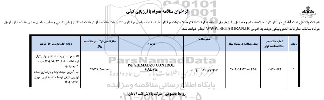 | 1 | 61.400 گ | 2004092179000451 | 01-90-0031172.P04 | P/F SHIMADZU CONTROL VALVE | 2.517.500.000 | الف- مهلت دریافت اسناد ارزیابی کیفی از سامانه ستاد از تاریخ 1404.6.22 لغایت 1404.7.5 ب- مهلت ارسال پاسخ استعلام 1404.7.19 |