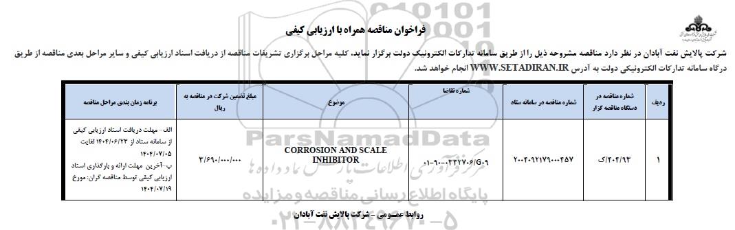 علاقهمندان میتوانند جهت دریافت اسناد و اطلاعات تکمیلی، مناقصه CORROSION AND SCALE INHIBITOR با سامانه مناقصات و مزایدات ایران پارسنماد داده ها 88349670 تماس حاصل نمایند.