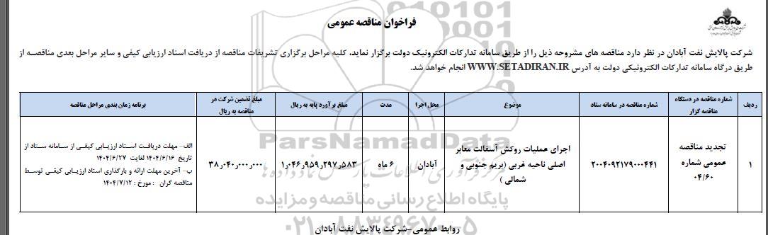 شرکت پالایش نفت آبادان در نظر دارد مناقصه مشروحه ذیل را از طریق سامانه تدارکات الکترونیک دولت برگزار نماید. کلیه مراحل برگزاری تشریفات مناقصه از دریافت اسناد ارزیابی کیفی و سایر مراحل بعدی مناقصه از طریق درگاه سامانه تدارکات الکترونیکی دولت به ادرس سایت ستاد انجام خواهد شد.