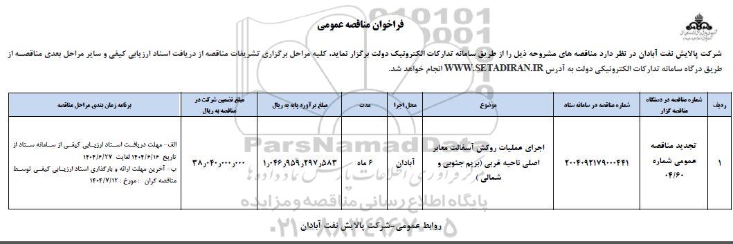 | 1 | تجدید مناقصه عمومی شماره 04.60 | 2004092179000441 | اجرای عملیات روکش آسفالت معابر اصلی ناحیه غربی (بریم جنوبی و شمالی) | آبادان | 6 ماه | 1.064.959.297.583 | 38.040.000.000 |