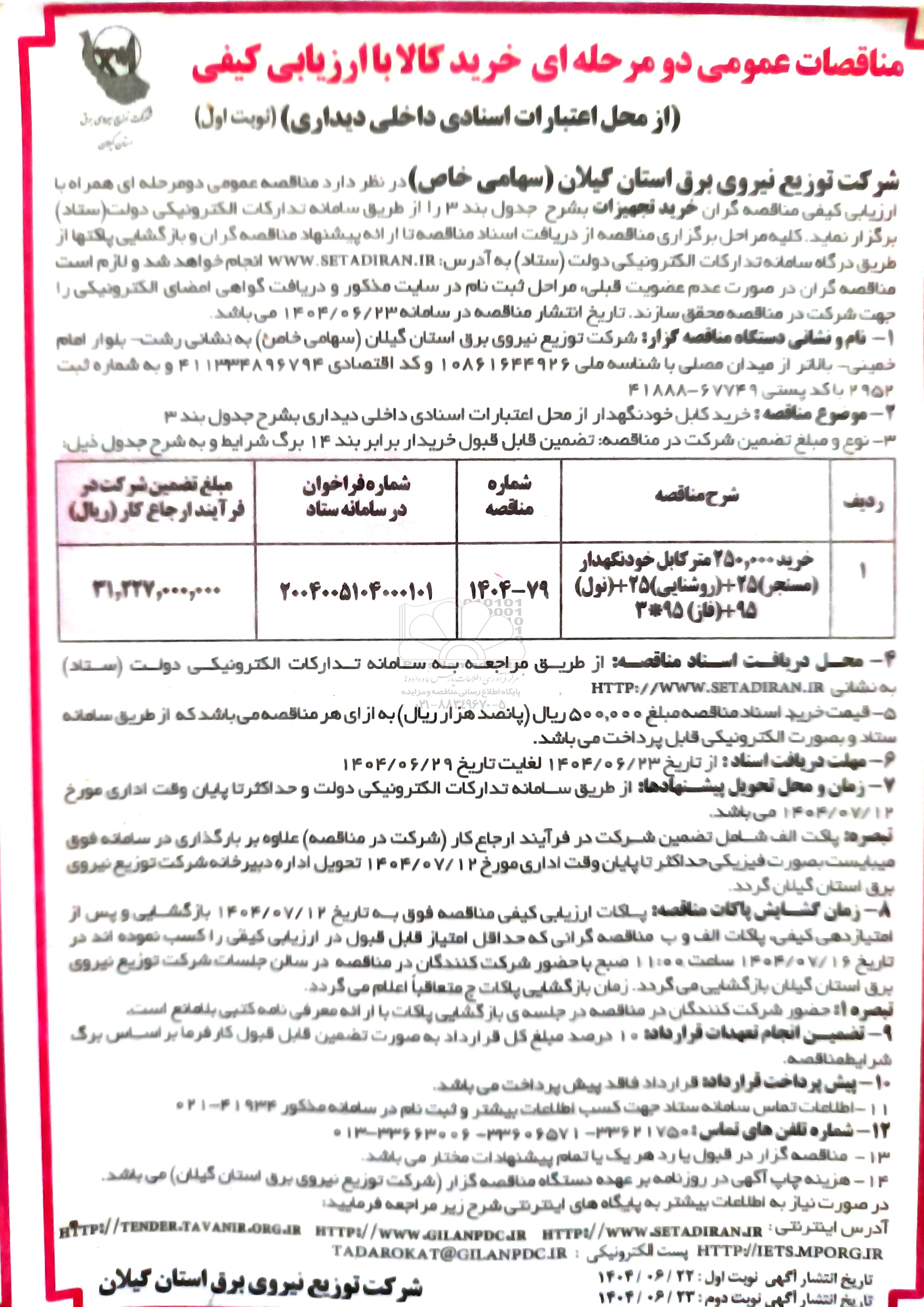 شرکت توزیع نیروی برق استان گیلان (سهامی خاص) در نظر دارد مناقصه عمومی دو مرحله ای همراه با ارزیابی کیفی مناقصه گران خرید تجهیزات بشرح جدول بند 3 را از طریق سامانه تدارکات الکترونیکی دولت (ستاد) برگزار نماید. کلیه مراحل برگزاری مناقصه از دریافت اسناد مناقصه تا ارائه پیشنهاد مناقصه گران و بازگشایی پاکت ها از طریق درگاه سامانه تدارکات الکترونیکی دولت (ستاد) به آدرس ستاد ایران انجام خواهد شد و لازم است مناقصه گران در صورت عدم عضویت قبلی مراحل ثبت نام در سایت مذکور و دریافت گواهی امضای الکترونیکی را جهت شرکت در مناقصه محقق سازند. تاریخ انتشار مناقصه در سامانه 1404.06.23 می باشد.