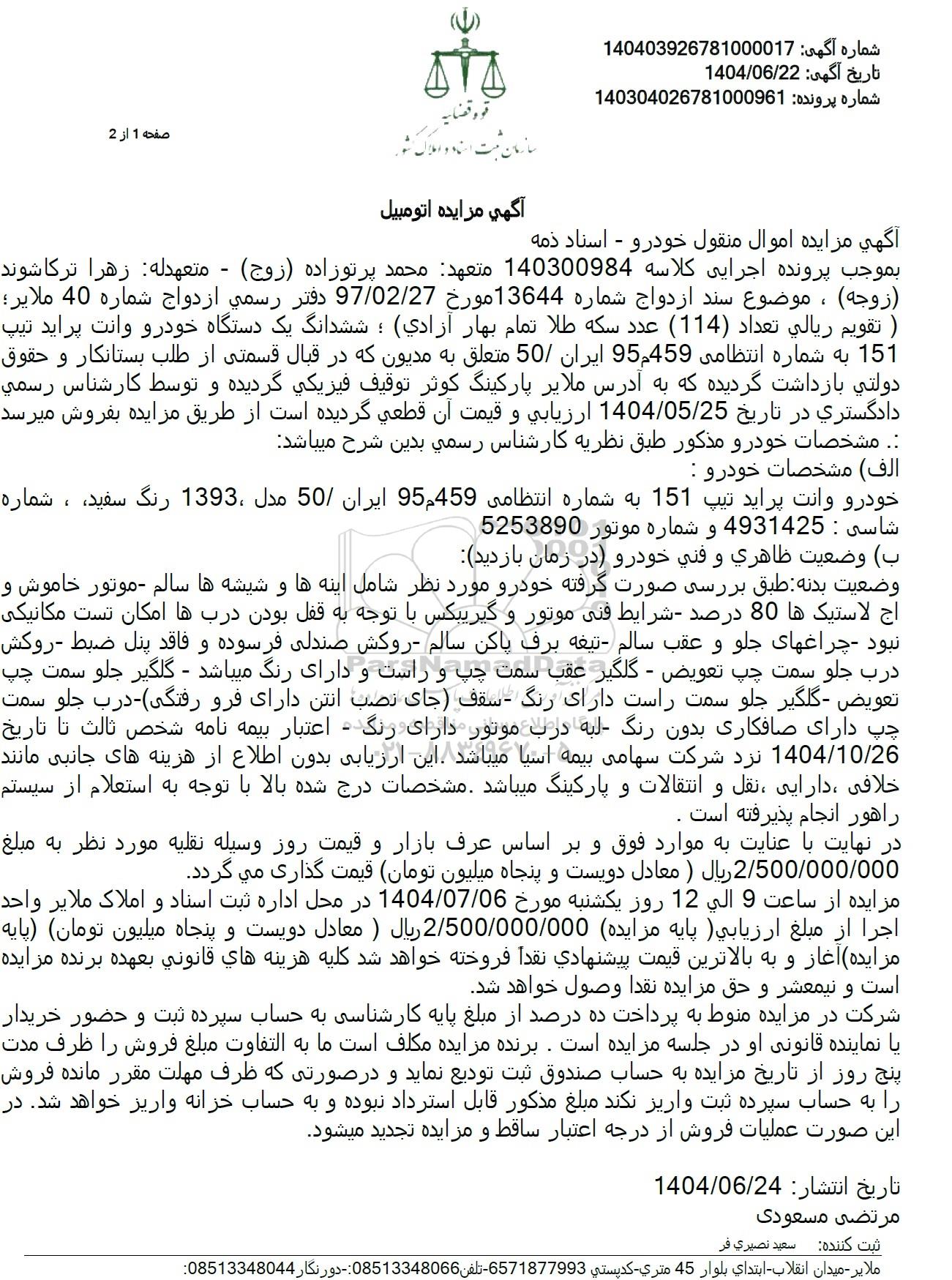 آگهی مزایده اتومبیل