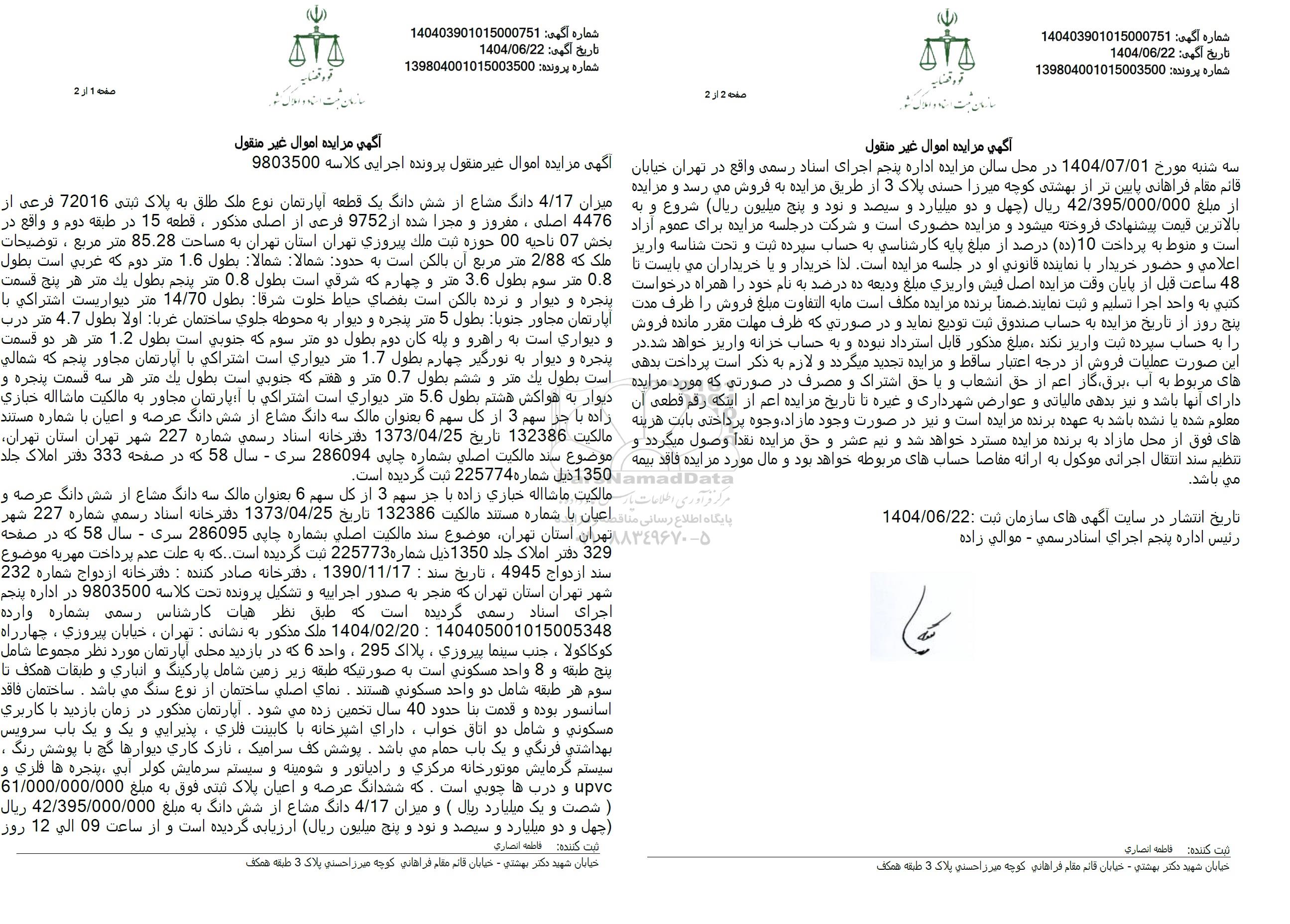 مزایده فروش شش دانگ یک قطعه آپارتمان به پلاک ثبتی 72016 فرعی از 4476 اصلی , مزایده فروش شش دانگ یک قطعه آپارتمان به پلاک ثبتی 72016 فرعی از 4476 اصلی
