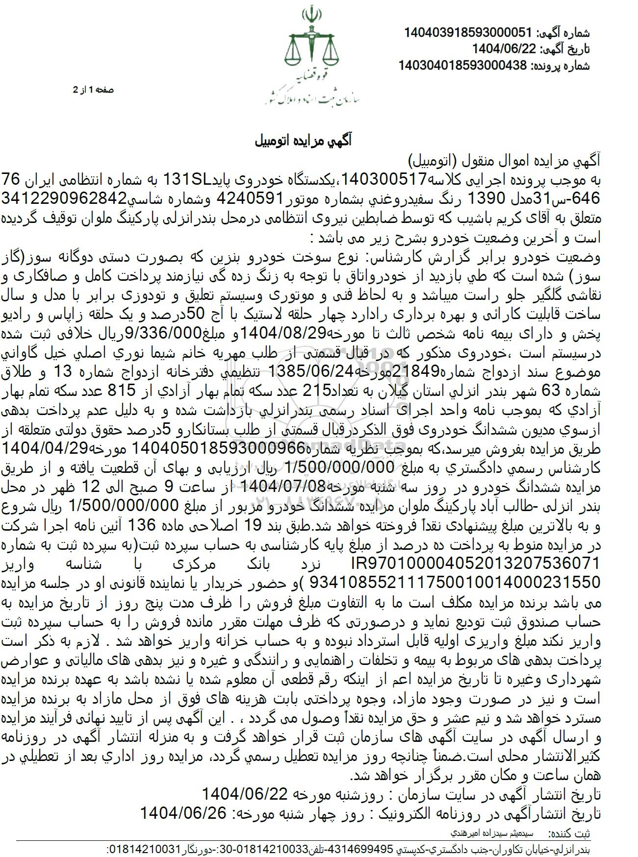 مزایده فروش یکدستگاه خودروی پراید 131 sl , مزایده فروش یکدستگاه خودروی پراید 131 sl