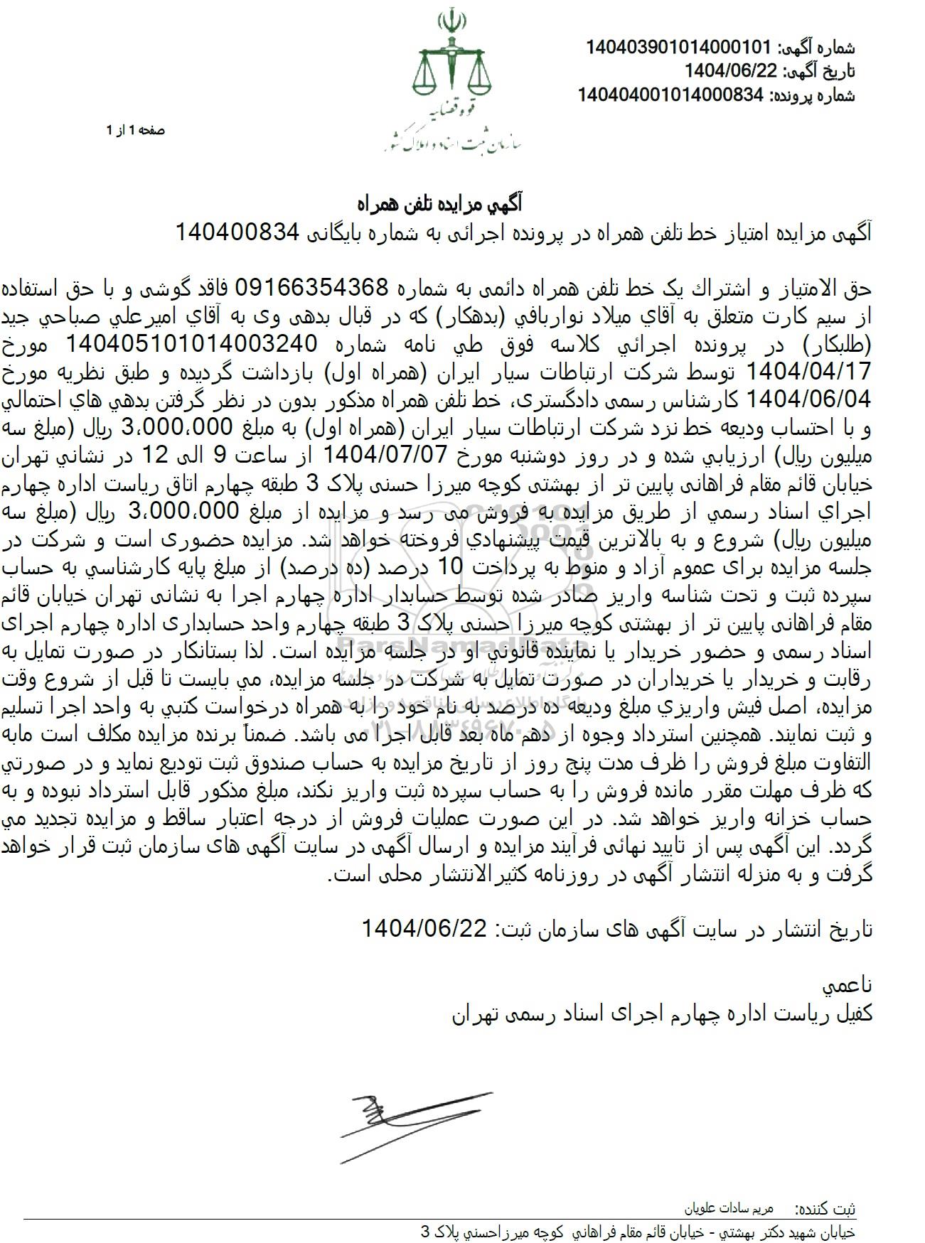 مزایده فروش حق الامتیاز و اشتراک خط تلفن همراه دائمی به شماره 09166354368 به مبلغ 3.000.000 ریال