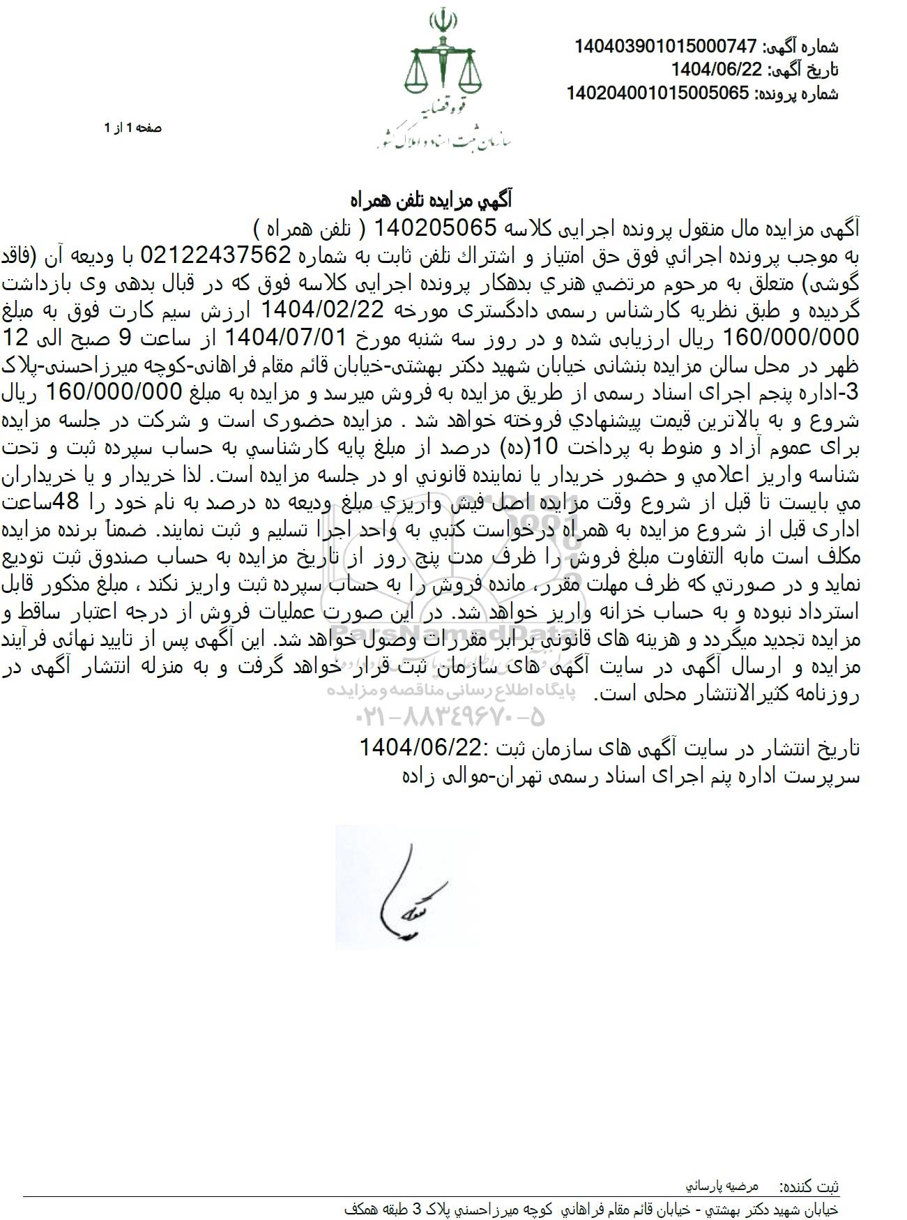 موضوع مزایده : حق امتیاز و اشتراک تلفن ثابت به شماره 02122437562 به ارزش 160.000.000 ریال