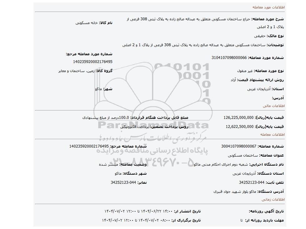 | شماره مورد معامله: 3104107098000066 | شماره مورد معامله مرجع: 140235920002176495 | |